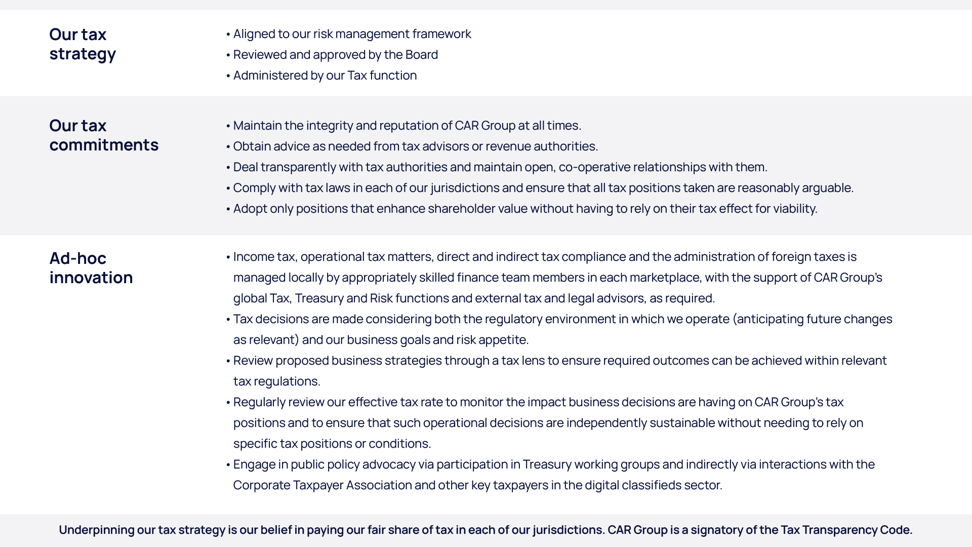 Our global risk management framework clearly sets the Board’s expectations for how each business manages risk, as well as the cadence of risk management activities to be conducted at the various levels throughout the organisation. CAR Group has a Group level global risk register in addition to an in‑country risk register for each marketplace.