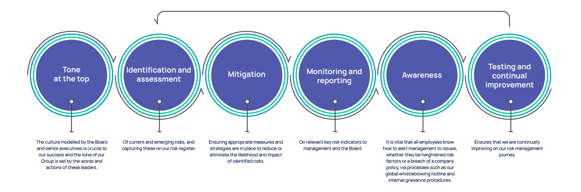 Our risk registers capture material and other potential risks to the business and assess the nature, likelihood and materiality of the impact of each risk. Each risk has at least two owners – one senior executive and one senior manager – and includes an explanation of what controls have been implemented to mitigate the risk. They are accompanied by a series of key risk indicators which are monitored monthly (in‑country risk registers) or quarterly (global risk register) and reported to the Board and Global Leadership Team. All risk registers are reviewed at least twice per year.