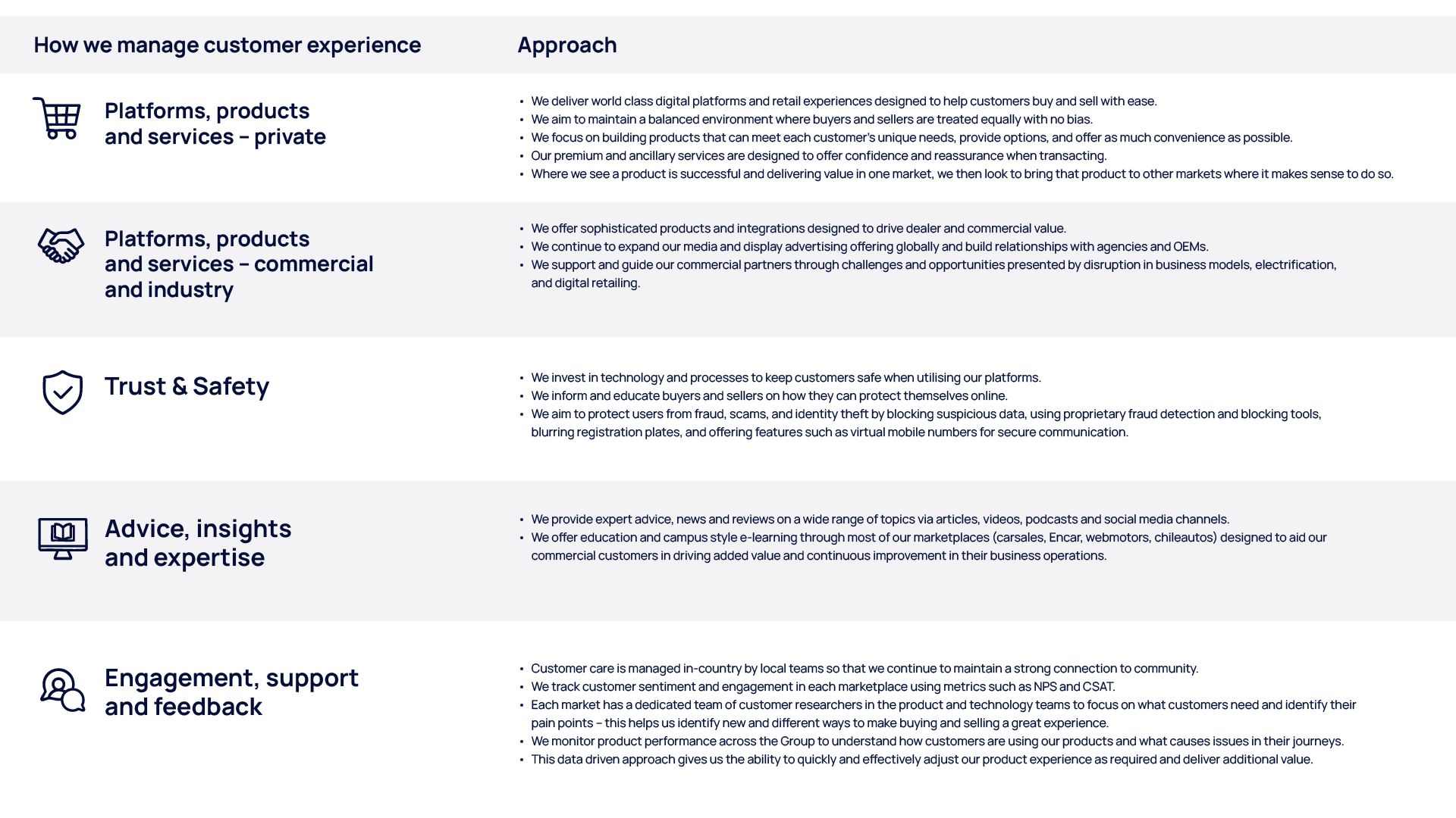 Our customers are the reason we exist. We are constantly seeking their feedback, analysing their interactions with our platforms, and looking for new and different ways that we can offer additional value to them to ensure that we deliver on our purpose – to make buying and selling a great experience. We achieve this by evolving our existing products and services and investing in new ones, enhancing platform functionality, offering expert advice, remaining focused on trust and safety, and embedding customer feedback into our decision-making processes.