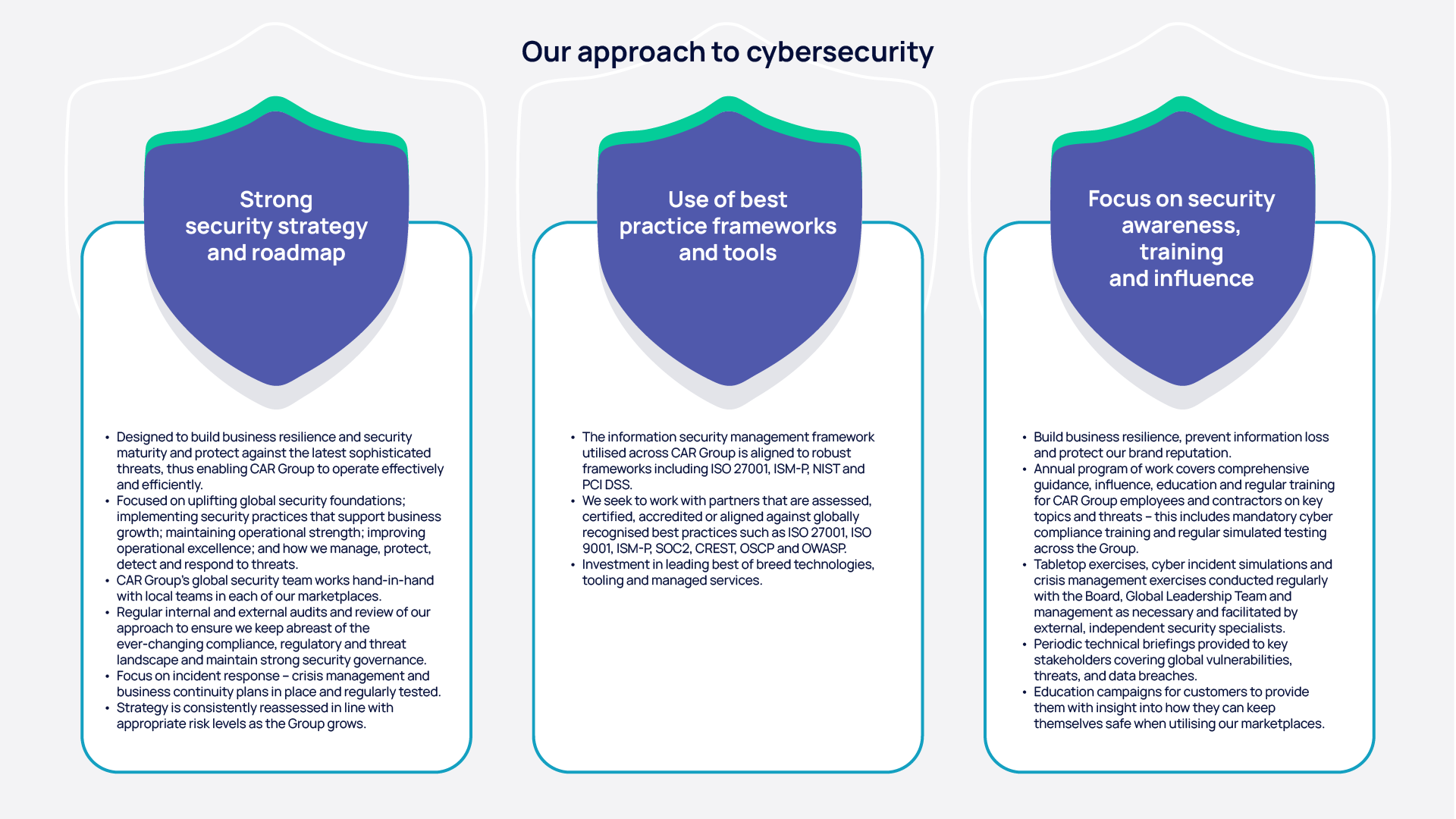 At CAR Group, cybersecurity is business‑centric, enterprisewide, threat‑aware, and risk‑focused. We are driven by our commitment to the security of our customers’ and employees’ data, our information systems, and our services.