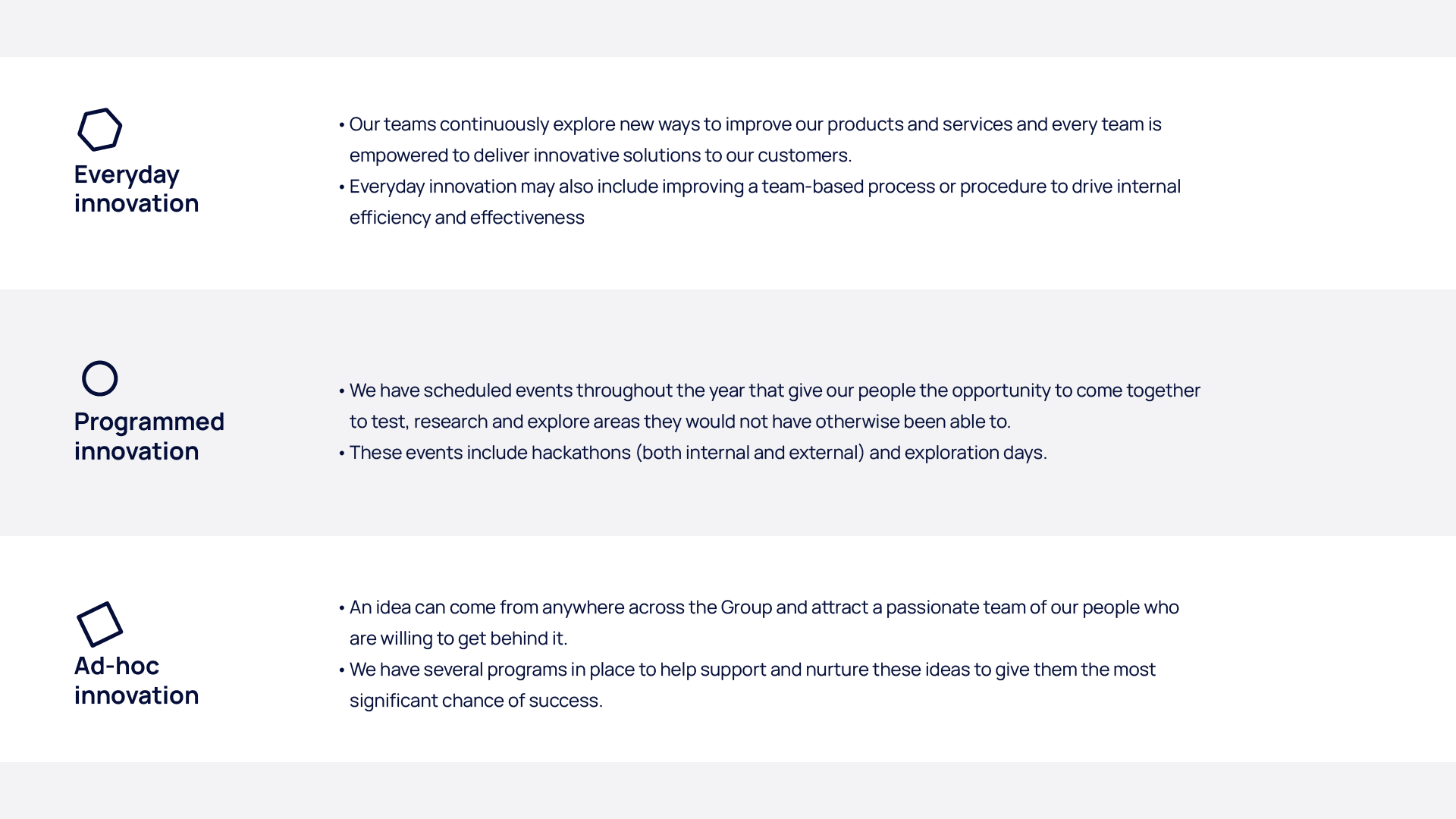 We view innovation not as a standalone function, but as a mindset embedded across our businesses. We are flexible in our approach to exploring and adopting new and exciting opportunities as they emerge, and we embrace and leverage technologies such as AI to our competitive advantage. However, we do so in a responsible way with appropriate governance measures in place.