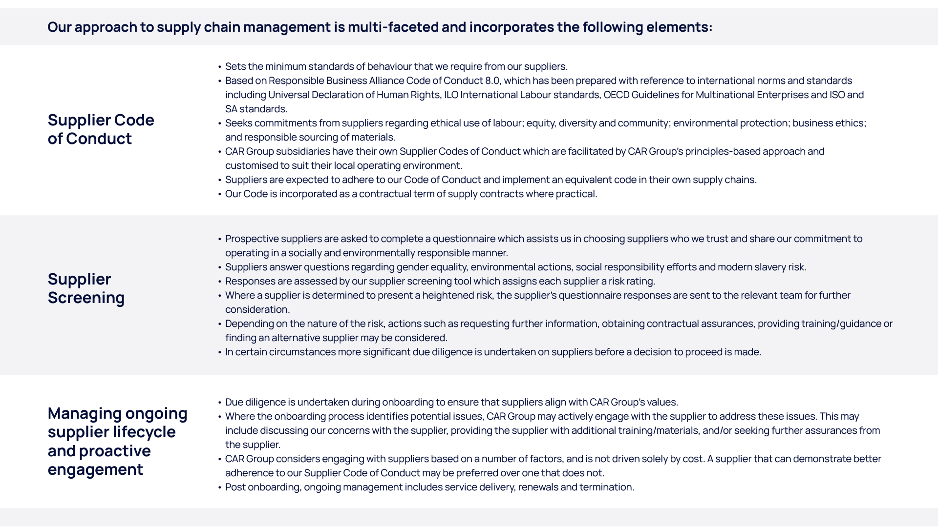 Our commitment to operating a socially and environmentally responsible business is underpinned by CAR Group’s Code of Conduct and Human Rights Policy. These commitments flow through to our suppliers and our supply chain engagement processes, which help us ensure we are doing business with suppliers that share our values, and whose conduct aligns with ours. Our success in remaining a leader in the long term lies in our operating model, which embeds sustainable business practices across our operations and supply chain.