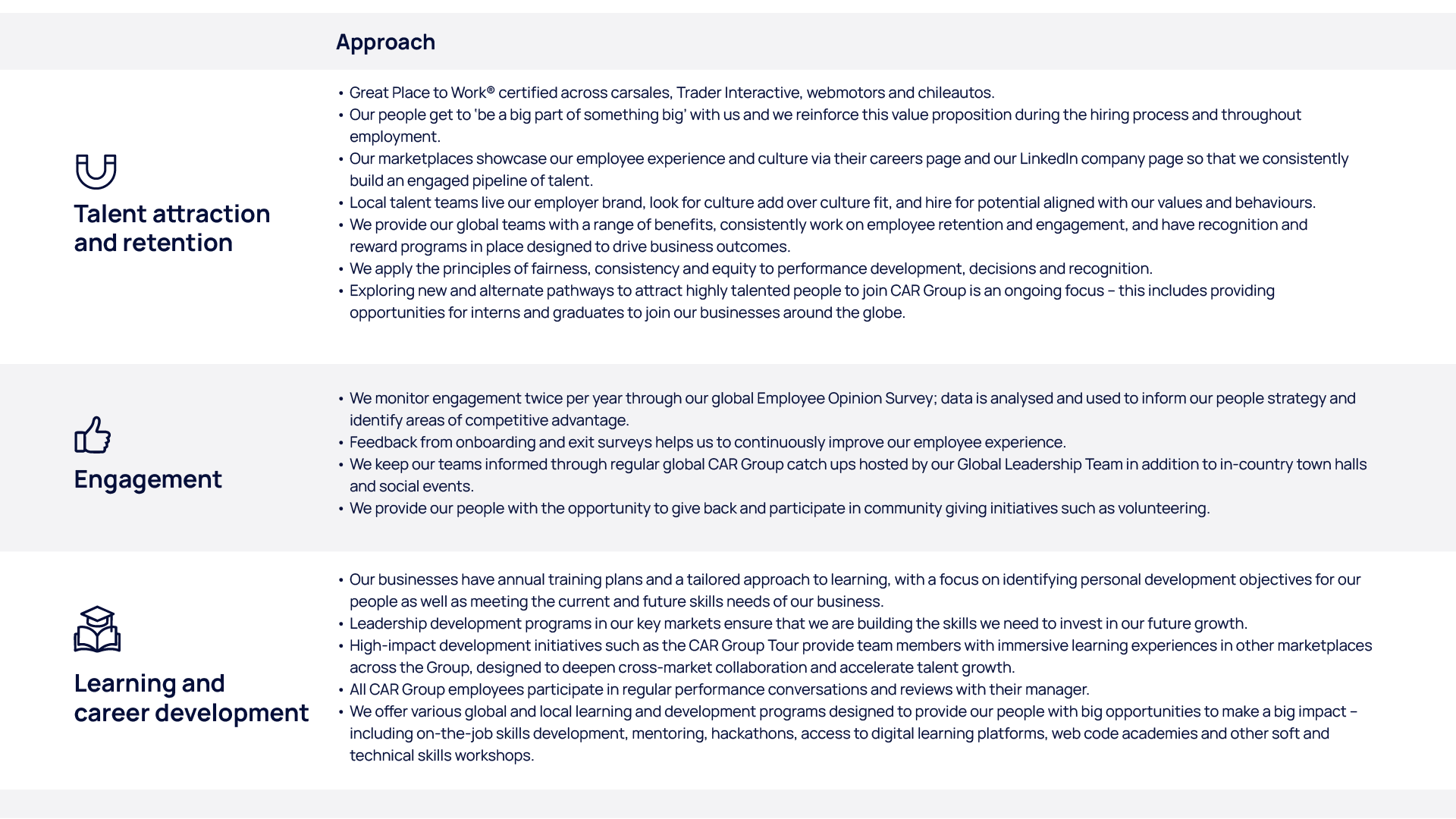 The following section outlines our approach to addressing these material topics at CAR Group. For a detailed review of our performance in these areas over the past year, please refer to our most recent Sustainability Report and Databook.